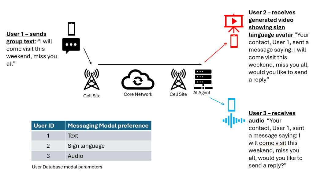 The mobile network, enhanced with AI capability on the edge, can implement an AI multimodal agent that would be able to lookup the user modal preference on the user database (CUDB, HSS) and upon receipt of a text message from user 1, would trigger the AI agent to generate a video of the message content through an Avatar using sign language so that User 2 can perfectly understand user 1’s message and also capture through user 2’s camera if they want to respond back.